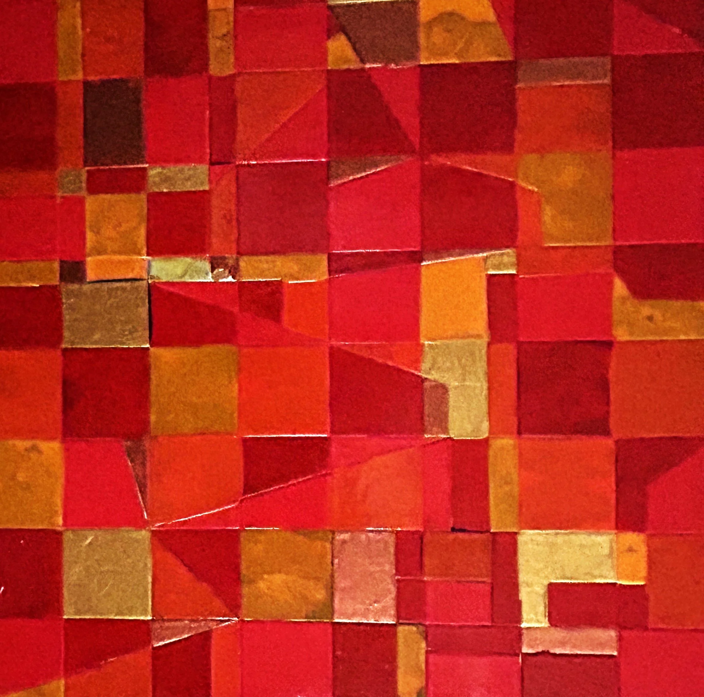 I am primarily curious about color, in particular bright vivid colors, so I have started work on a series of monochromatic or near monochromatic paintings, focusing on what I can do with a limited palate centered around one brilliant color. I started with red and have also explored green, blue, orange and crimson. Iām not sure why these squares fascinate me so much, but they do. Perhaps it is the way the closely-related colors reverberate and try to influence each other.